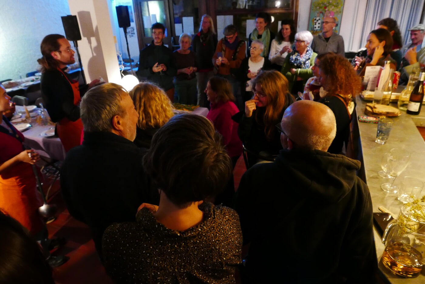 Forcément on aborde les changements climatiques, l’après-neige, la raréfaction de l’eau, le changement de biotopes. On parle aussi des pratiques de la montagne, de la chasse, de la pêche, de la cueillette de lichens pour les grands parfumeurs, de champignons, de plantes médicinales…. On découvre alors des double & triple activités, des revenus de compléments, de la capacité de résilience des habitants et de leur sens de la débrouille. On cueille des aliments et des histoires. 3 soirées pour 3 manières de partager l’enquête et nos points de vue sur le sujet. 3 équipes aux fourneaux et à l’orchestration du temps fort du soir. 3 publics et configurations spécifiques.