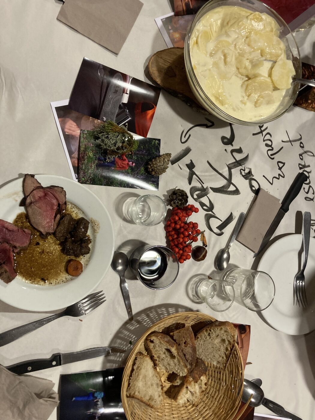 Forcément on aborde les changements climatiques, l’après-neige, la raréfaction de l’eau, le changement de biotopes. On parle aussi des pratiques de la montagne, de la chasse, de la pêche, de la cueillette de lichens pour les grands parfumeurs, de champignons, de plantes médicinales…. On découvre alors des double & triple activités, des revenus de compléments, de la capacité de résilience des habitants et de leur sens de la débrouille. On cueille des aliments et des histoires. 3 soirées pour 3 manières de partager l’enquête et nos points de vue sur le sujet. 3 équipes aux fourneaux et à l’orchestration du temps fort du soir. 3 publics et configurations spécifiques.
